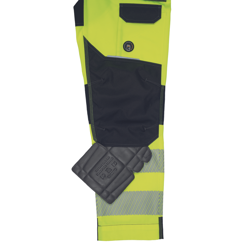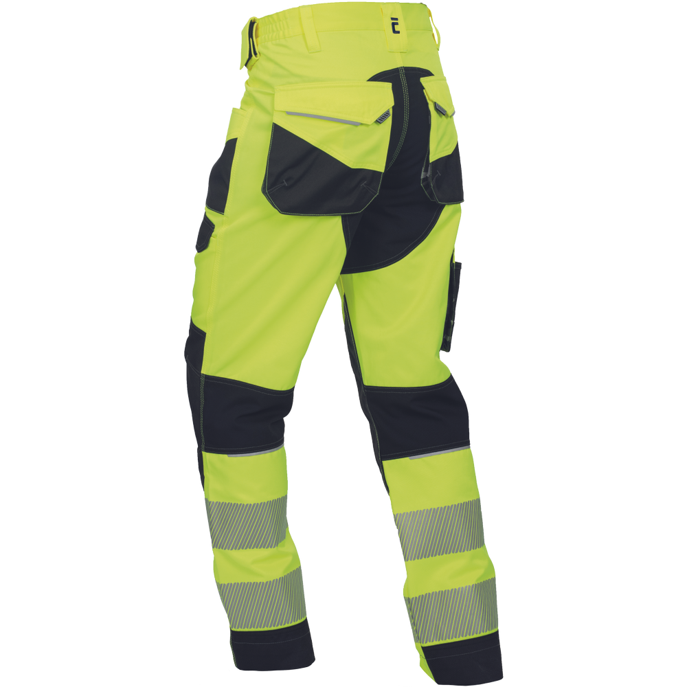pánské pracovní HI-VIS kalhoty s pružným pasem a multifunkčními kapsami; Oxford 600D zesílení kolenních kapes pro vkládání ochranných nákoleníků; odolné trojité prošití nohavic a sedu; 2 tištěné reflexní segmentované 7 cm pruhy na spodní části nohavic; nastavitelná délka nohavic.