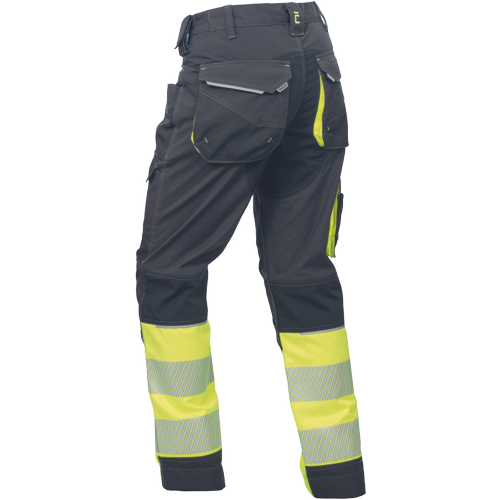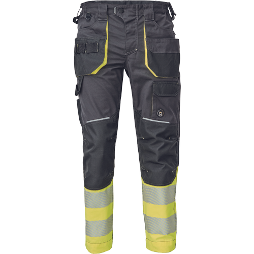 Pánské pracovní HI-VIS kalhoty s pružným pasem a multifunkčními kapsami; Oxford 600D zesílení kolenních kapes pro vkládání ochranných nákoleníků; odolné trojité prošití nohavic a sedu; 2 tištěné reflexní segmentované 7 cm pruhy na spodní části nohavic; nastavitelná délka nohavic.