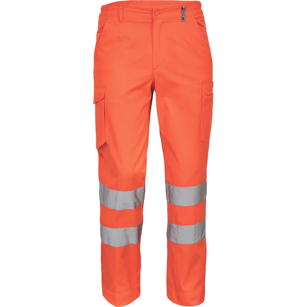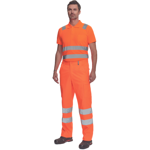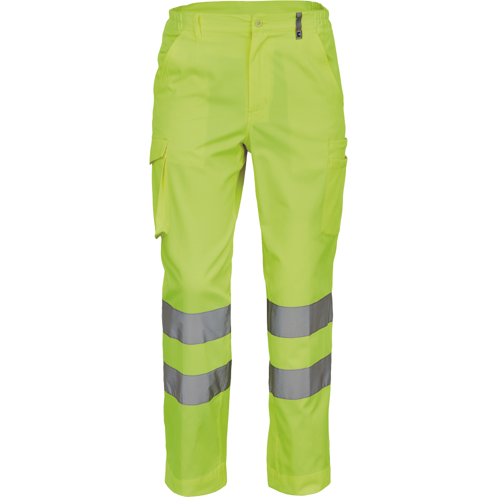 Pánské lehké full HI-VIS pracovní kalhoty a reflexními pruhy na nohavicích, elastický pas; 2 boční kapsy.