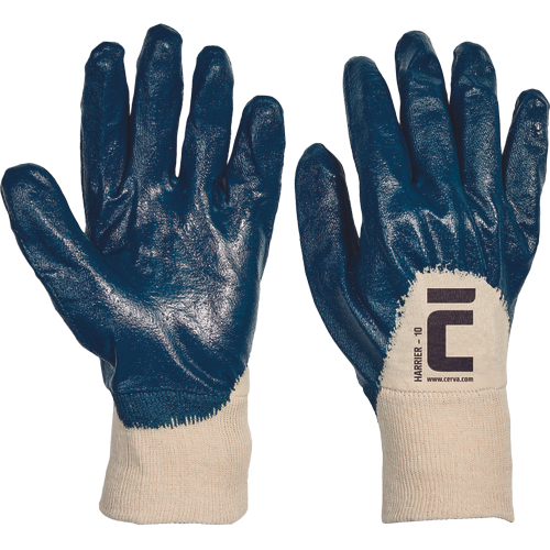 Rukavice šité z bavlněného úpletu, polomáčené v modrém nitrilu, s pružným nápletem, č. 7" - 10"