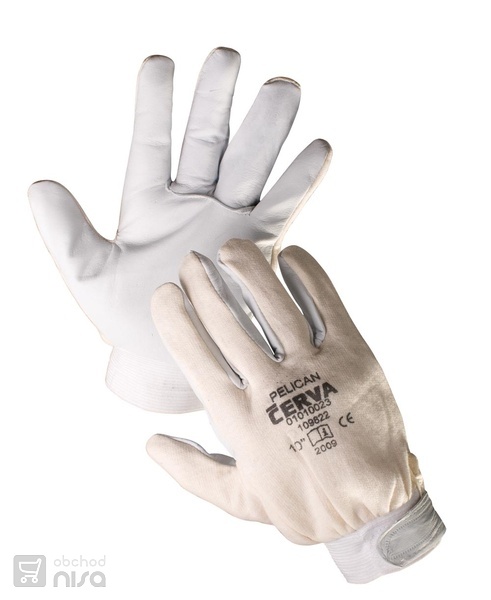 Rukavice šité z jemné lícové kozinky v dlani, bílé bavlněné tkaniny hřbetua manžetou na suchý zip