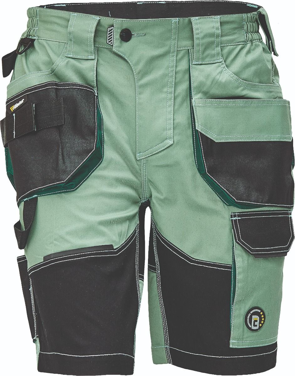 Pracovní šortky, elastický inovativní materiál TRIFIBETEX, ergonomický střih, snížený pružný pas, odolné trojité prošití nohavic a sedu, zesílená kapsa na nákoleníky.