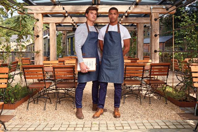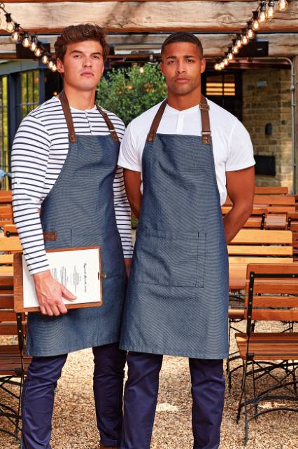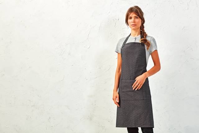 zástěra s náprsenkou 100% bavlna 220g/m2 z barvených bavlněných nití, které jsou vzájemně protkány pro příjemný kontrastní efekt