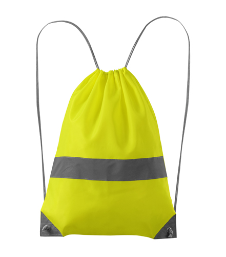 Praktický batoh na záda z fluorescenčního materiálu. Reflexní prvky v dolních rozích. Dvě stahovací šňůrky. Vnitřní kapsa na zip.