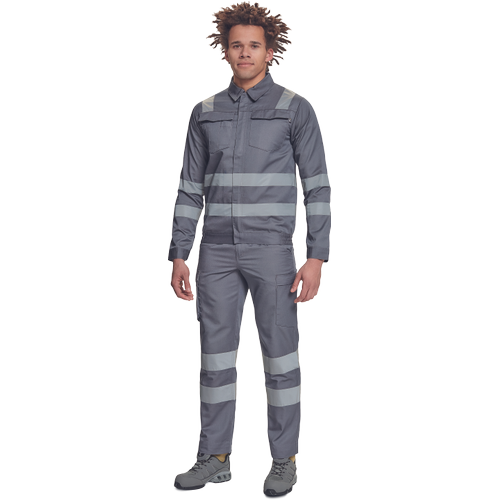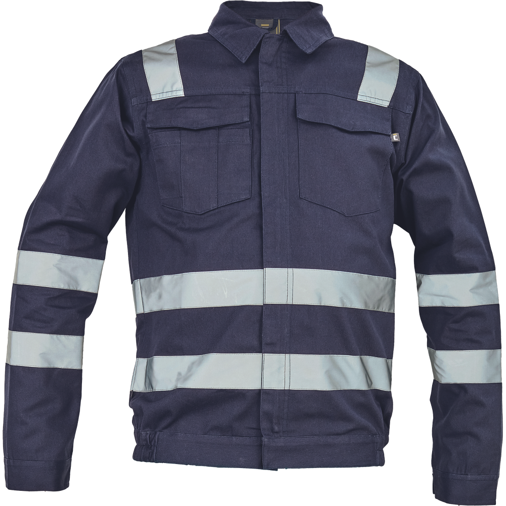 Pánská lehká pracovní bunda s reflexními pruhy přes ramena, v bocích a na rukávech; zapínání na zip kryté légou na suchý zip; 2 náprsní kapsy s klopou.
