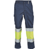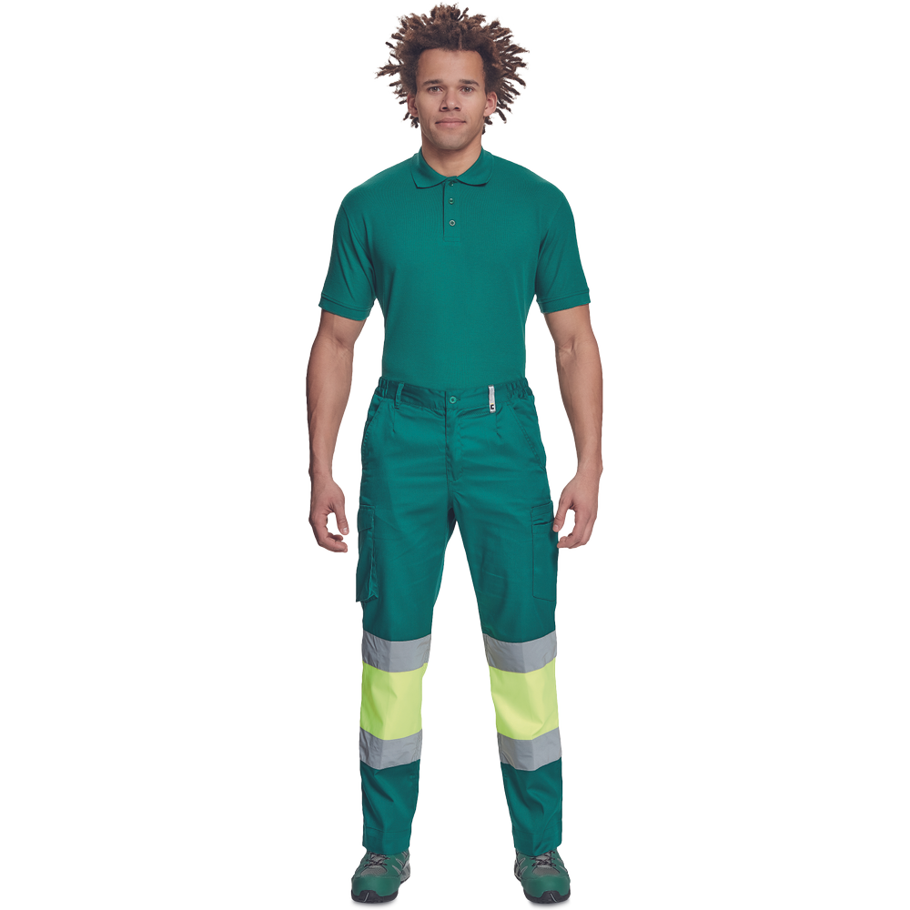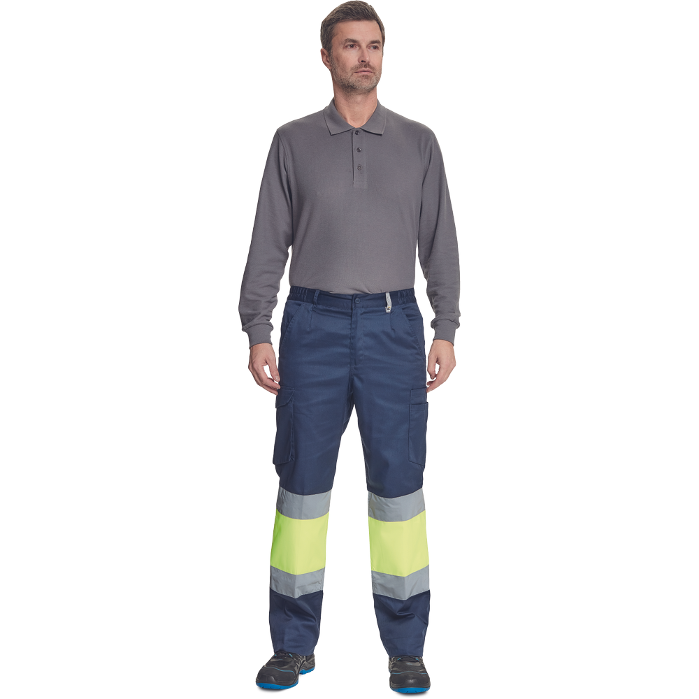 Pánské lehké pracovní kalhoty v kombinaci s HI-VIS holenní částí s reflexními pruhy, elastický pas; 2 postranní kapsy, 1 kapsička na mince; 2 stehenní kapsy, 2 zadní kapsy; nastavitelná délka nohavic.