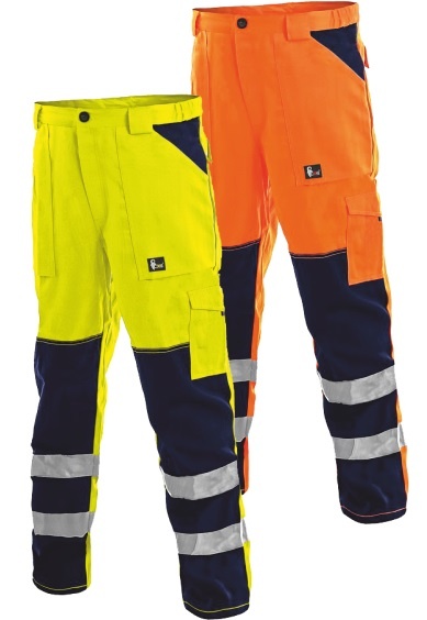 Pánské do pasu, výstražné, pevný pas s gumou v bocích, poutka na opasek, přední a zadní našité kapsy, boční kapsa s kapsičkou na mobil