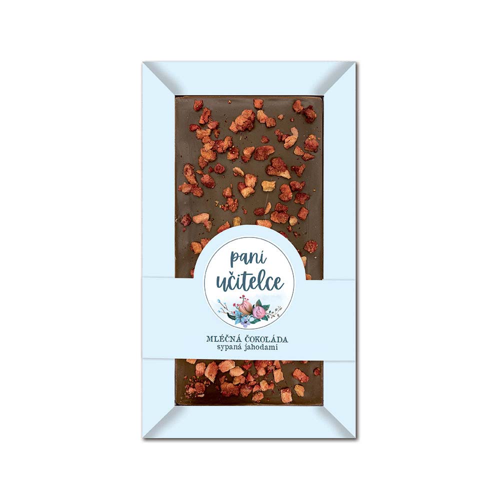 Dárková ručně vyráběná sypaná mléčná čokoláda 80 g s jahodami – paní učitelce. Extra jemná výběrová čokoláda s výraznou chutí a vysokým podílem kakaového másla. Krásný sladký dárek pro paní učitelku jako poděkování za její důležitou práci a ochotu.