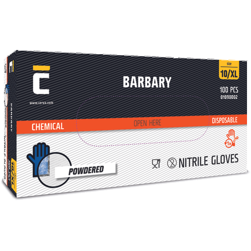 Jednorázové nitrilové rukavice, 0,12 mm, délka 24 cm, rolovaný okraj, krabice po 100 kusech, pudrované, velikosti S-01, M-02, L-03, XL-04.