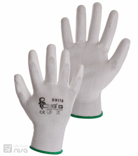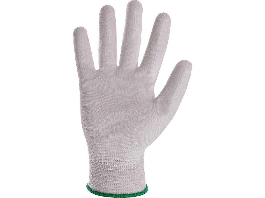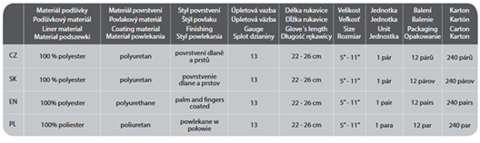 Rukavice s nylonový bezešvým úpletem, dlaň a prsty máčené v Polyuretanu. Neobsahují silikon