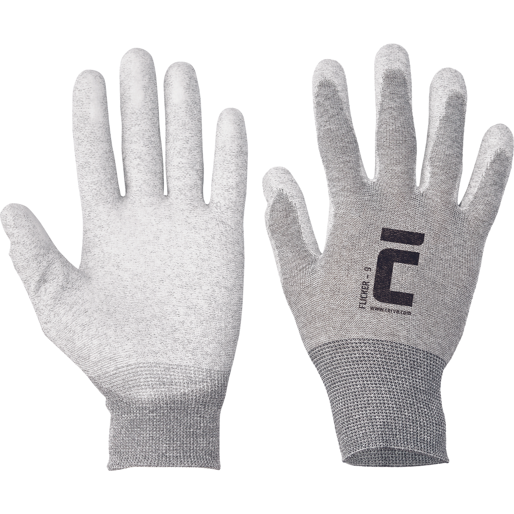 Pletené bezešvé antistatické nylonové rukavice s integrovaným uhlíkovým vláknem, vrstvou polyuretanu v dlani a na prstech a pružnou manžetou.