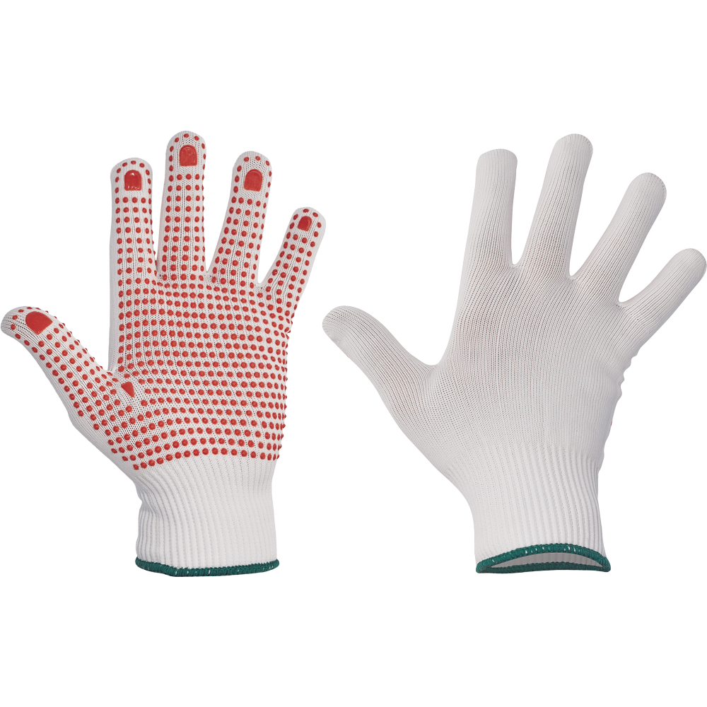 Pletené bezešvé nylonové rukavice s PVC terčíky v dlani a na prstech a pružným úpletem na zápěstí.