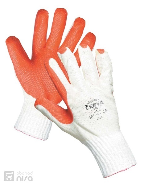 Pletené rukavice ze silné směsné příze polyester/bavlna, napuštěné latexem, s další silnou vrstvou latexu v dlani a na prstech a pružným nápletem, č.
