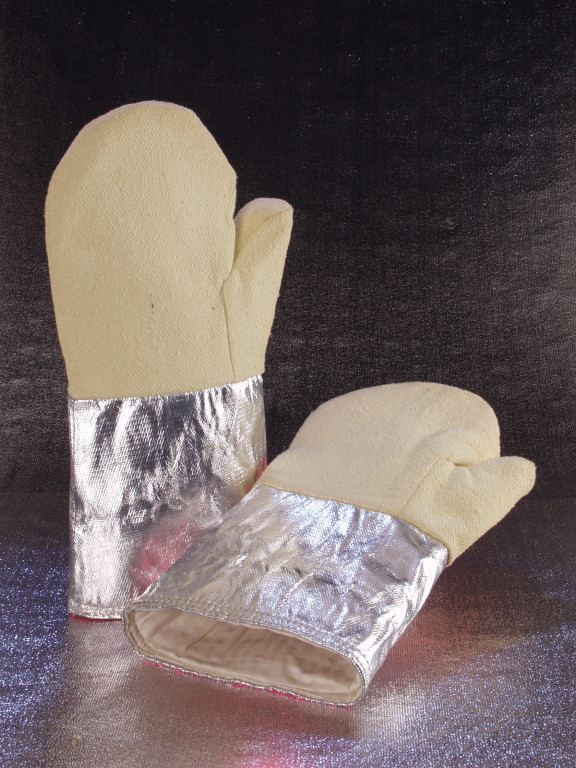 Oboustranné palcové třívrstvé rukavice s ochranou před kontaktním teplem do 450 C, krátkodobě i do 600 C, s vložkou ze 100% bavlny, s pohliníkovanou manžetou chránící před sálavým teplem a odstřikem taveniny.