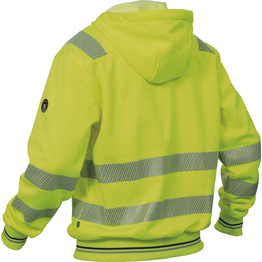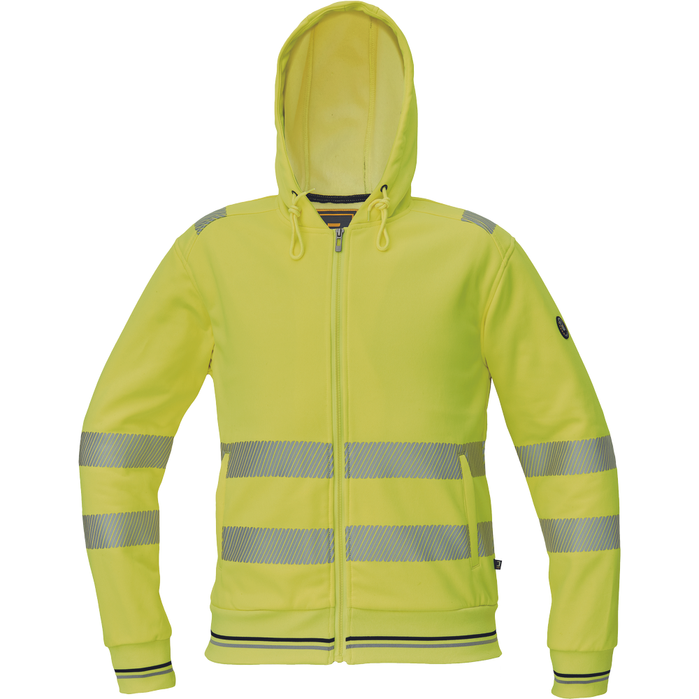 Celopropínací HI-VIS mikina s kapucí ze směsového úpletu bavlny a polyesteru zevnitř nepočesaná; dvojitá kapuce s kontrastním úpletem v barvě zipu a dekorativního prošití; pružné náplety na rukávech a spodním obvodu; tištěné reflexní segmentované 5 cm pruhy okolo pasu, rukávů a přes ramena.