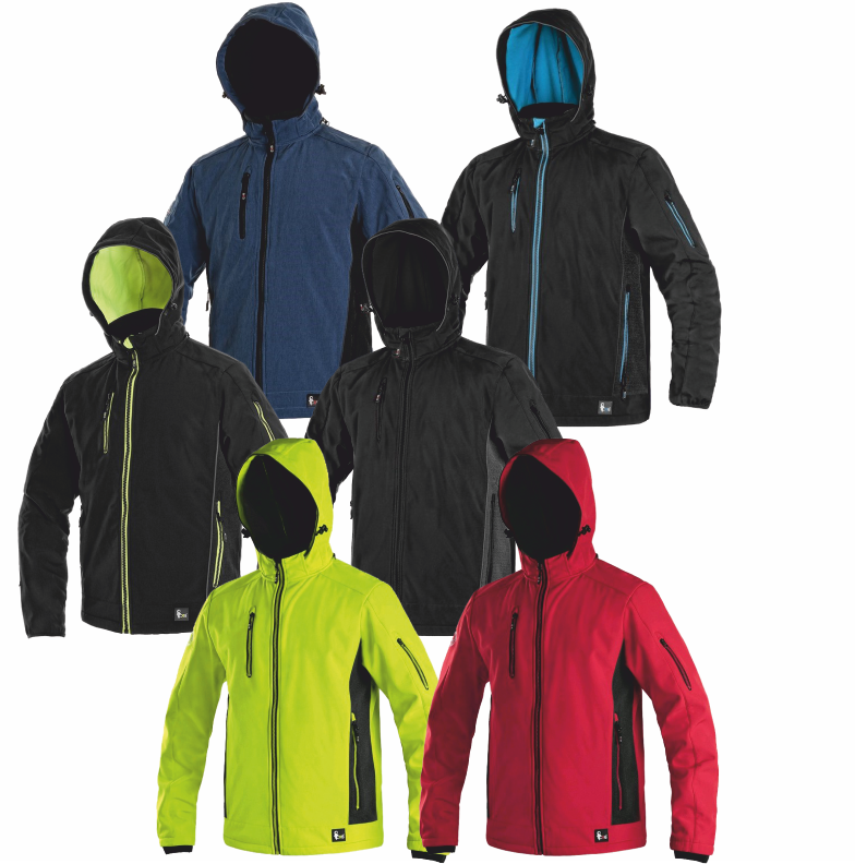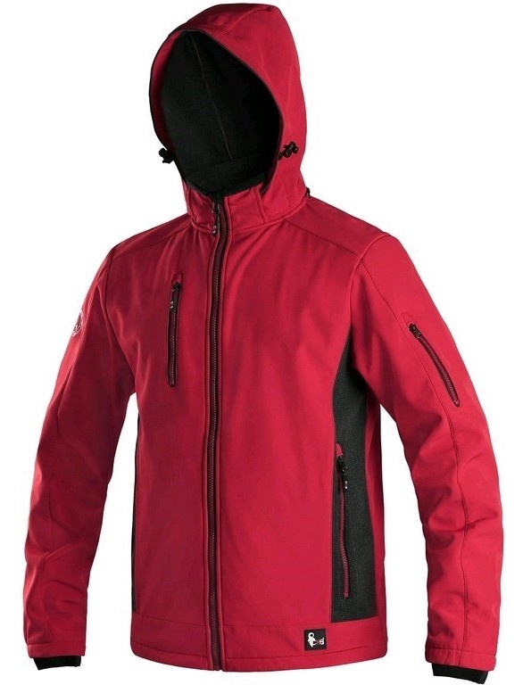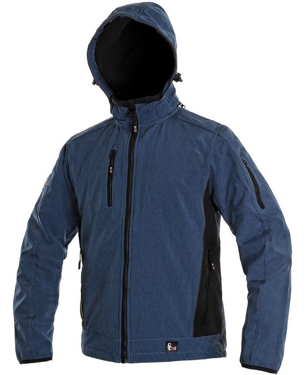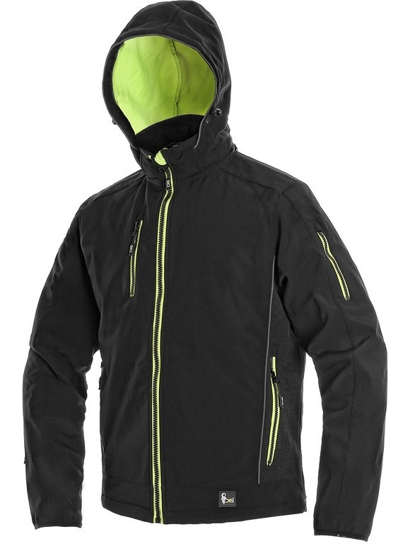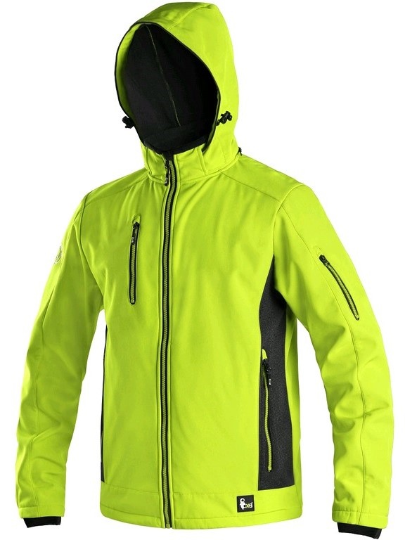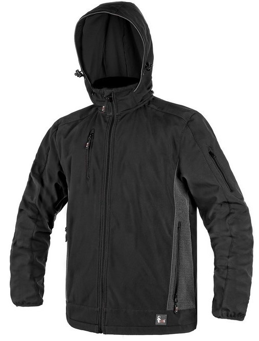 Pánská softshellová bunda, odolná proti vodě a větru, odepínací kapuce, pružné manžety v rukávech, stahování v dolním okraji, černé reflexní výpustky, fleecový límec i vnitřní strana bundy, TPU membrána, paropropustnost 3 000 g/m2/24 hod. Na levém rukávu kapsička na zip, 2 spodní kapsy na zip, náprsní kapsa na zip.