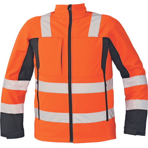 hi-vis softshellová bunda se dvěma postranními kapsami • náprsní kapsa na zip