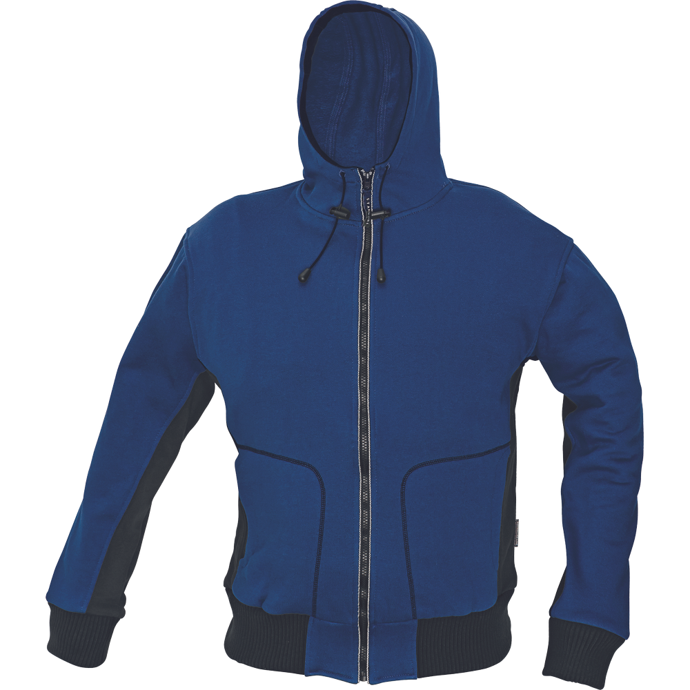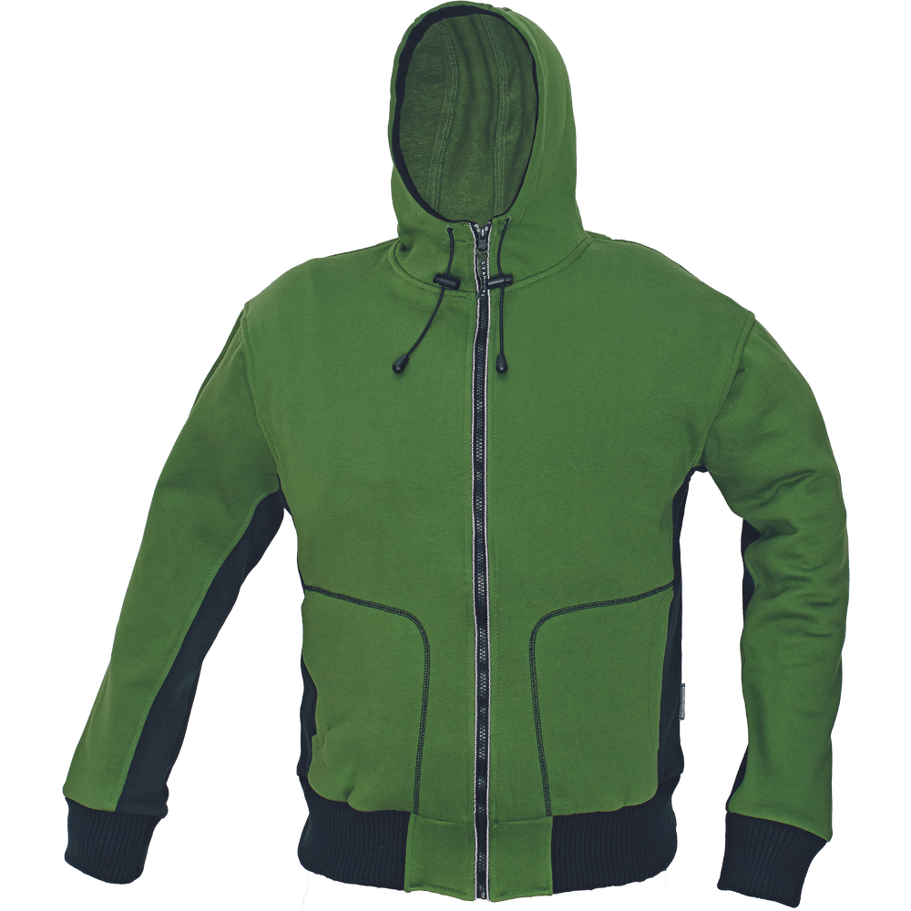 mikina s nastavitelnou kapucí pomocí stahovací šňůrky a zapínáním na zip; 2 přední velké kapsy; spodní lem a manžety rukávů z extra širokého žebrovaného úpletu s příměsí elastanu.