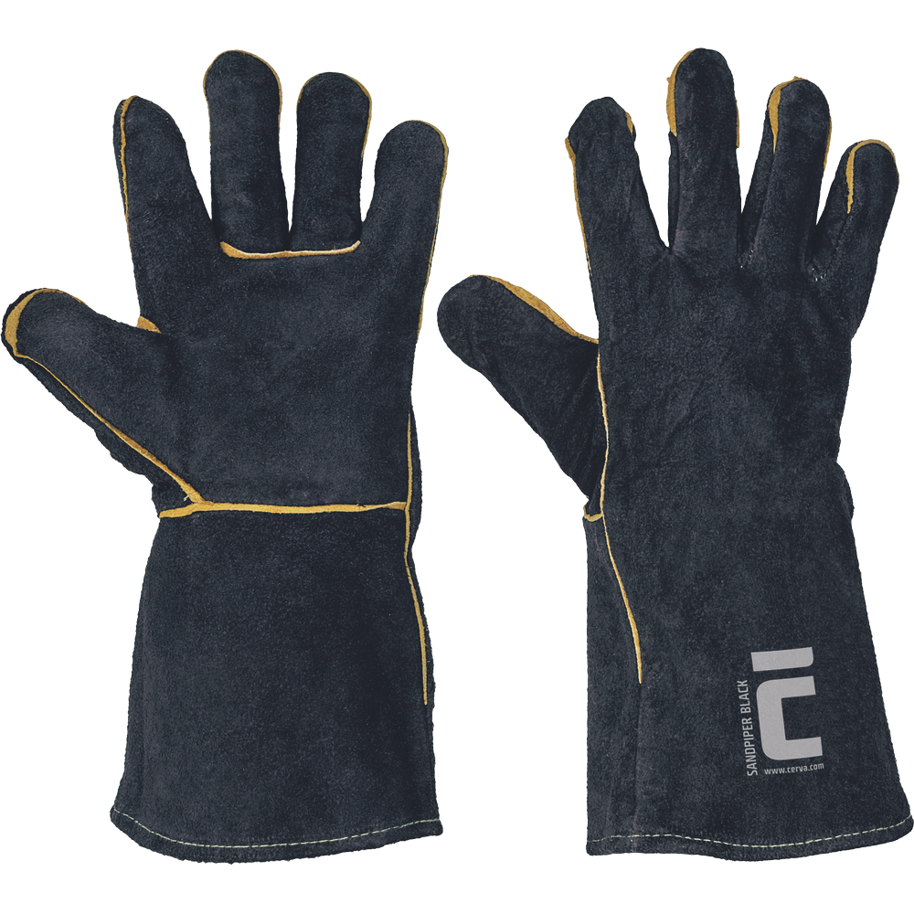 Celokožené rukavice z hovězí štípenky v délce 35 cm, s bavlněnou podšívkou a krytými švy. Certifikát: svářečské práce - typ A