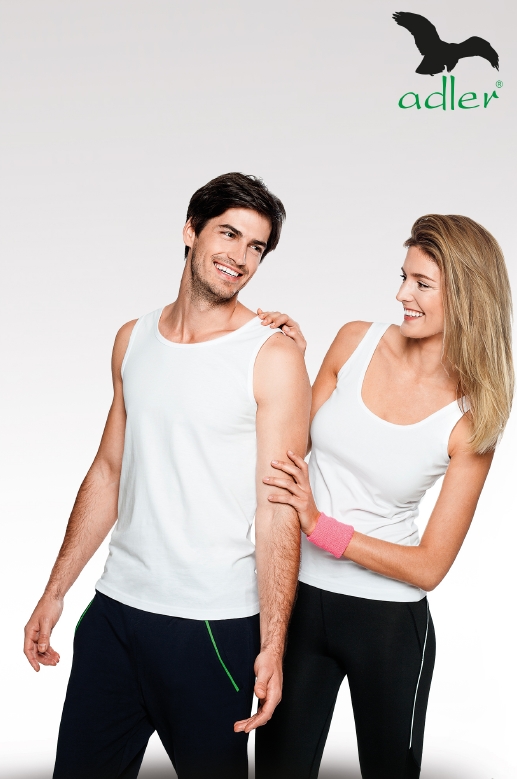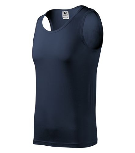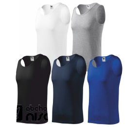 Pánské tílko střední gramáže. Tubulární střih. Průkrčník a průramky začištěny lemem z vrchového materiálu.