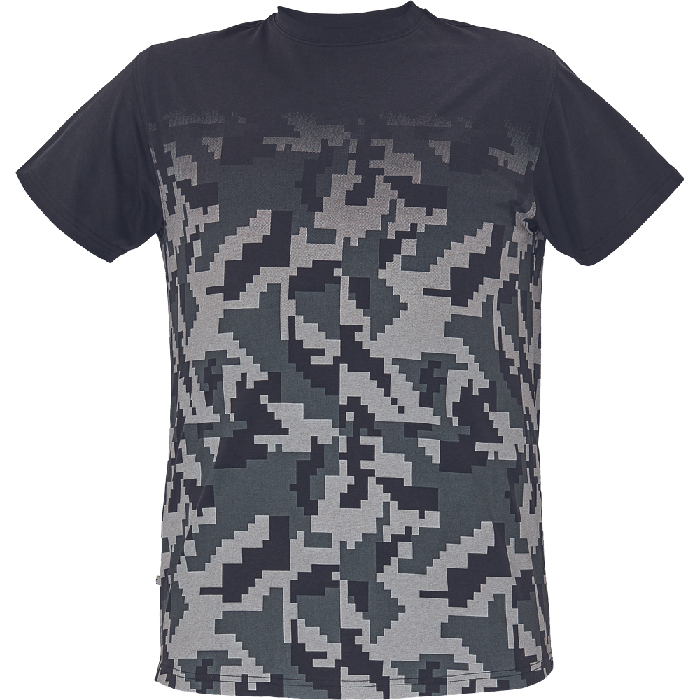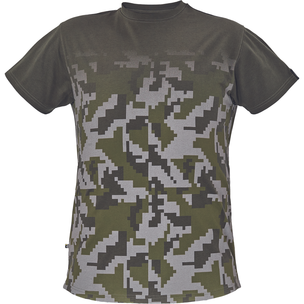 Pánské tričko s krátkým rukávem v moderním maskáčovém vzoru s elastickým průkrčníkem.