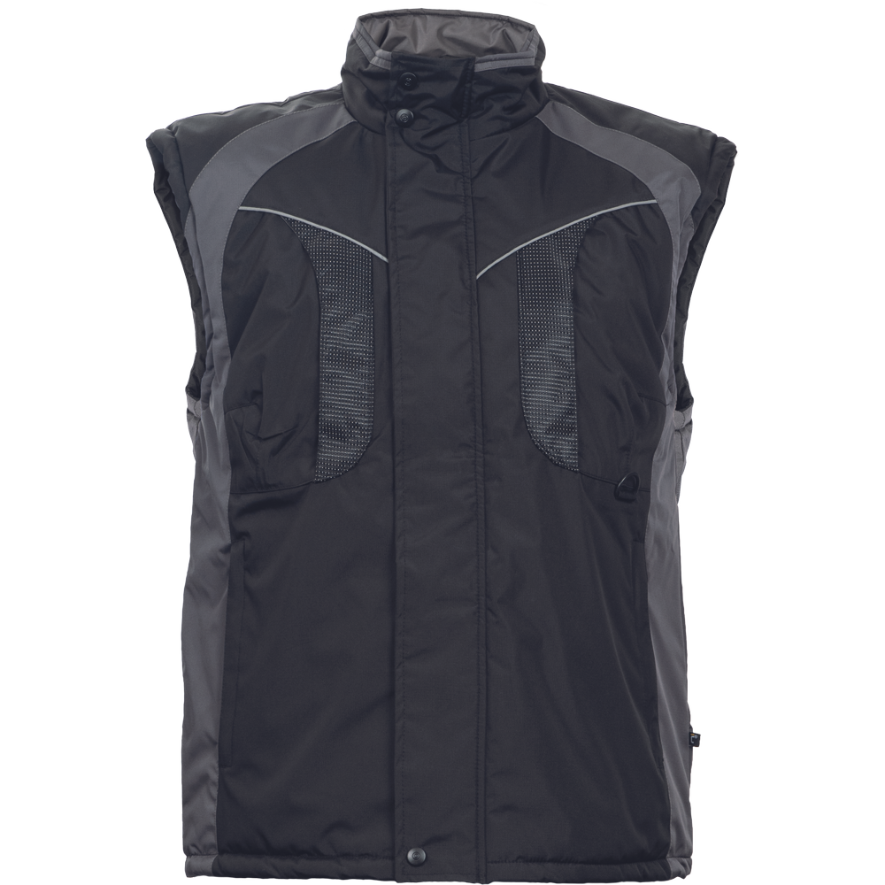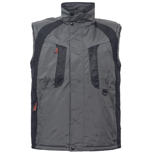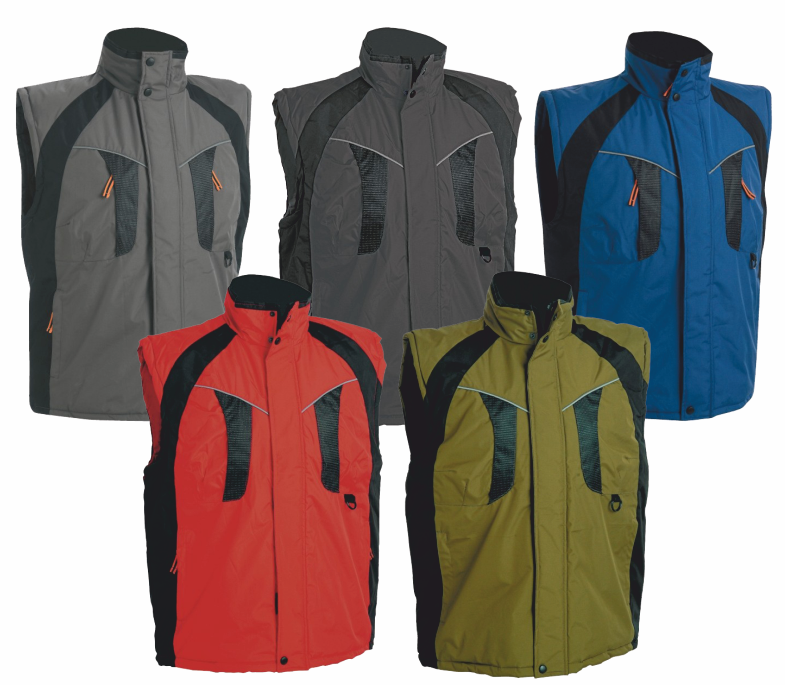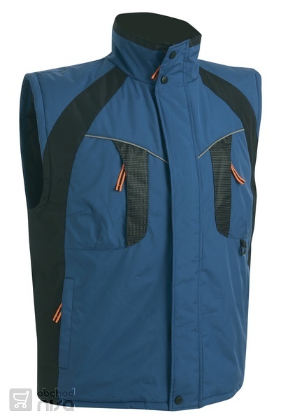 Zateplená nepromokavá vesta, 100% polyester povrstvený PVC, zateplení a podšívka polyester, vnitřní kapsa na mobil.
