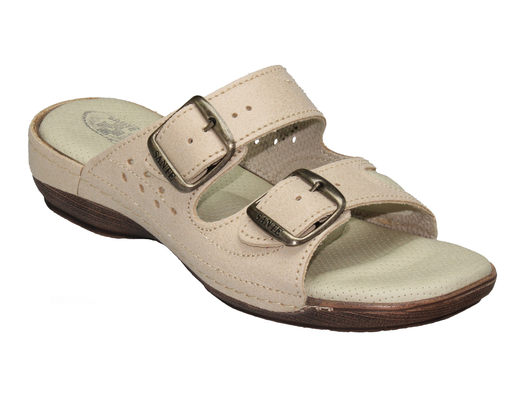 Pohodlná zdravotní obuv  SANTÉ, se speciální stélkou proti pocení nohou a s anatomicky tvarovanou stélkou, která podepírá příčnou i podélnou klenbu, čímž zabraňuje vzniku ploché nohy.  s anatomicky tvarovanou stélkou, která podepírá příčnou i podélnou klenbu, čímž zabraňuje vzniku ploché nohy.  Pantofle značky SANTÉ jsou velmi pohodlné a dodávají noze potřebný komfort i při dlouhodobém nošení. Jsou určeny jako zdravotní , pracovní, domácí či vycházková letní obuv.  Je vyroben z kůže v bílé barvě a prodává se ve velikostech 36 - 41.