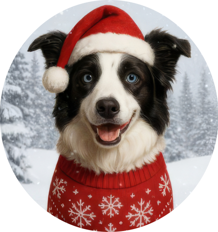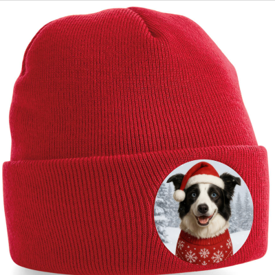 Zahřejte se stylově s naší roztomilou zimní čepicí zdobenou motivem Border kolie, v santovské čepičce a vánočním svetříku. Tento hravý design potěší každého milovníka Kolií a vánočních motivů.