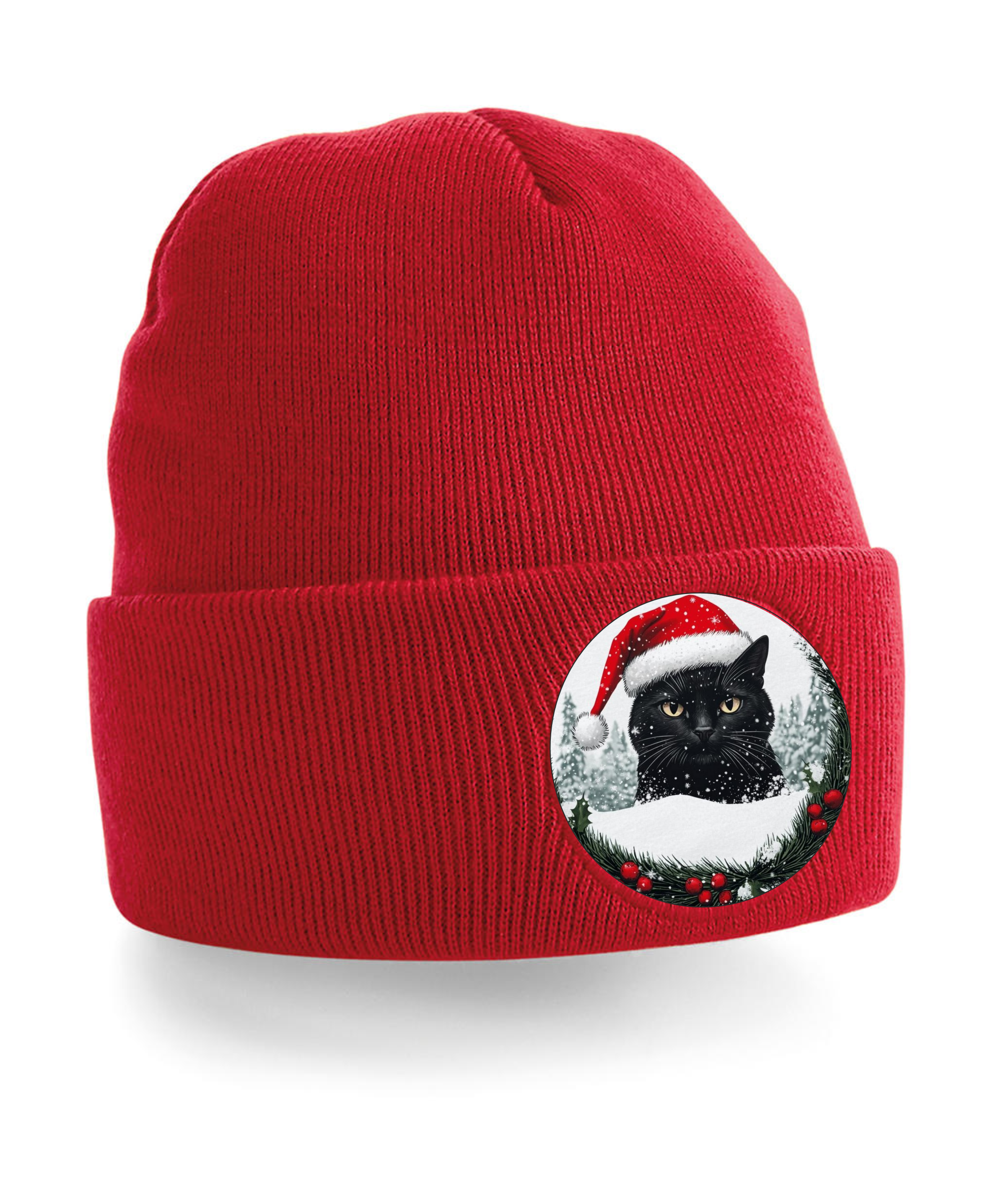 Zahřejte se stylově s naší roztomilou zimní čepicí zdobenou motivem černého kocourka, v santovské čepičce a vánočním svetříku. Tento hravý design potěší každého milovníka koček a vánočních motivů.