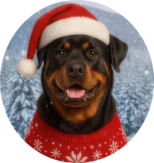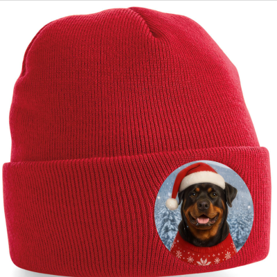 Zahřejte se stylově s naší roztomilou zimní čepicí zdobenou motivem Rotvajlera, v santovské čepičce a vánočním svetříku. Tento hravý design potěší každého milovníka Rotvajlera a vánočních motivů.