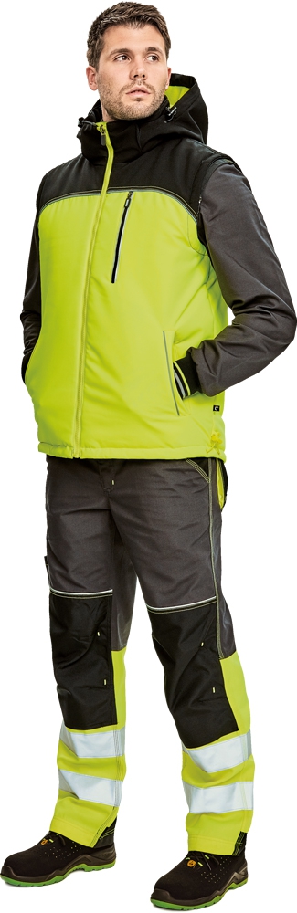 • pánská oboustranná zateplená vesta s odnímaelnou kapucí vhodnou pro obě verze nošení vesty • Jedna strana v hi-vis provedení • zesílená oblast ramen • náprsní kaspa na zip a 2 postranní lištové kapsy • lemování sedla a kapes reflektivní paspulkou • dvojitá kapuce s kontrastním hi-vis úpletem v barvě dekorativního kontrastního prošití • nastavitelná šířka spodního obvodu
